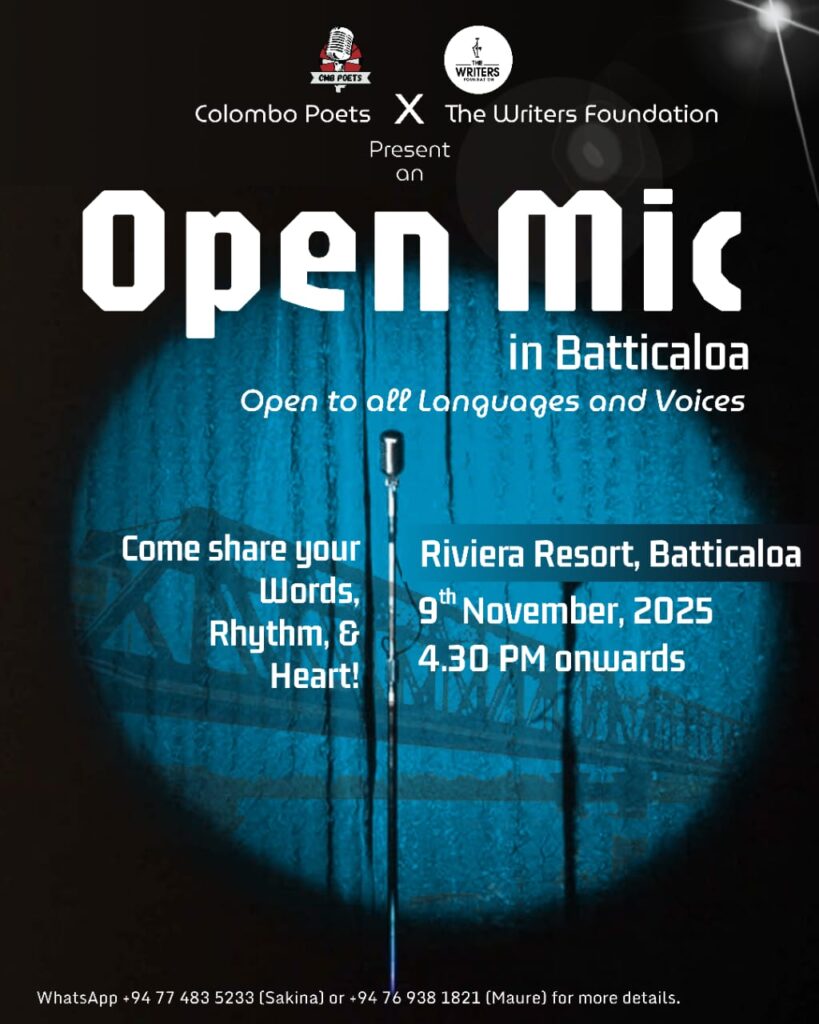 An Open Mic on 9th November 2025, (Sunday), 4:30 PM onwards at Riveria Resort, Batticaloa.